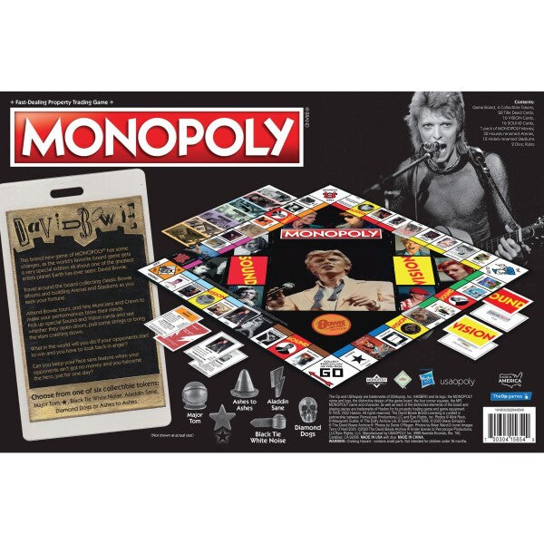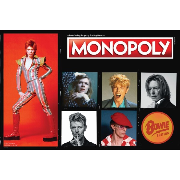 Relive the fame and take things over in a special edition of the fast dealing, property trading game that pays homage to the Thin White Duke! MONOPOLY: David Bowie gathers the ultimate collection of the rock superstar’s greatest records for fans to buy, sell, and trade albums such as The Rise and Fall of Ziggy Stardust and The Spiders from Mars. Build Arenas and Stadiums atop Bowie’s discography with six custom sculpted tokens representing memorable studio albums: Major Tom, Black Star, Black Tie White Noise, Aladdin Sane, Diamond Dogs, and Ashes to Ashes. Sound and Vision cards will take you on the musical journey to be the furthest above the moon with any money to win!