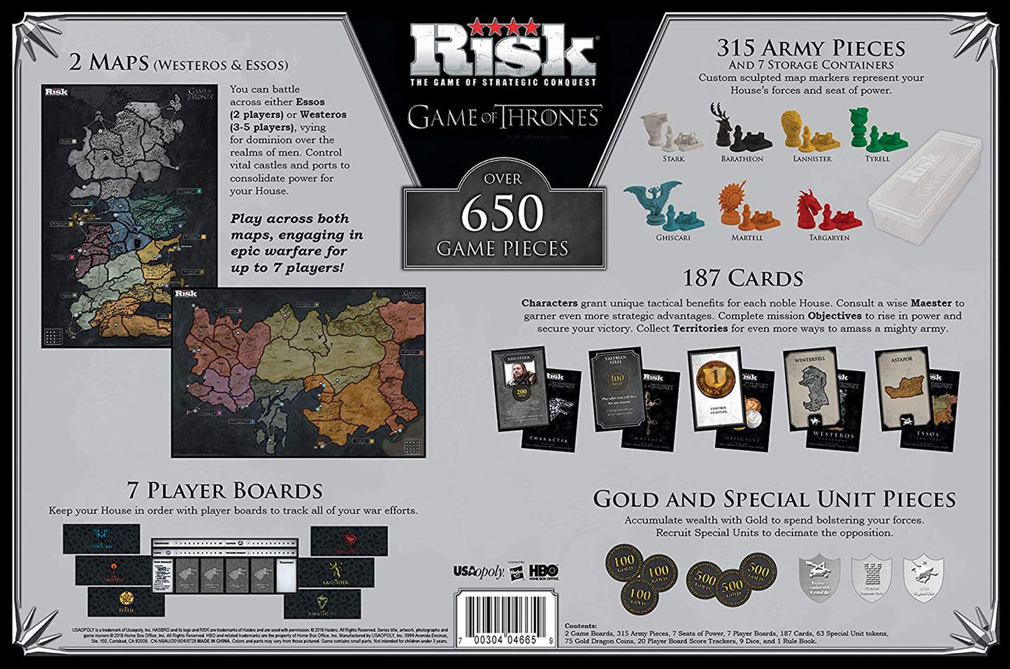 RISK : édition Game of Thrones le jeu classique de conquête stratégique, à un niveau épique de chaos et de guerre dans une bataille pour le Trône de fer. Avec un emballage de jeu frappant, deux plateaux de jeu personnalisés, trois façons de jouer, sept armées finement sculptées, et plus de 650 pièces au total, ce jeu de conquête stratégique va tester l'esprit et la bravoure des fans de Risk et de Game of Thrones.